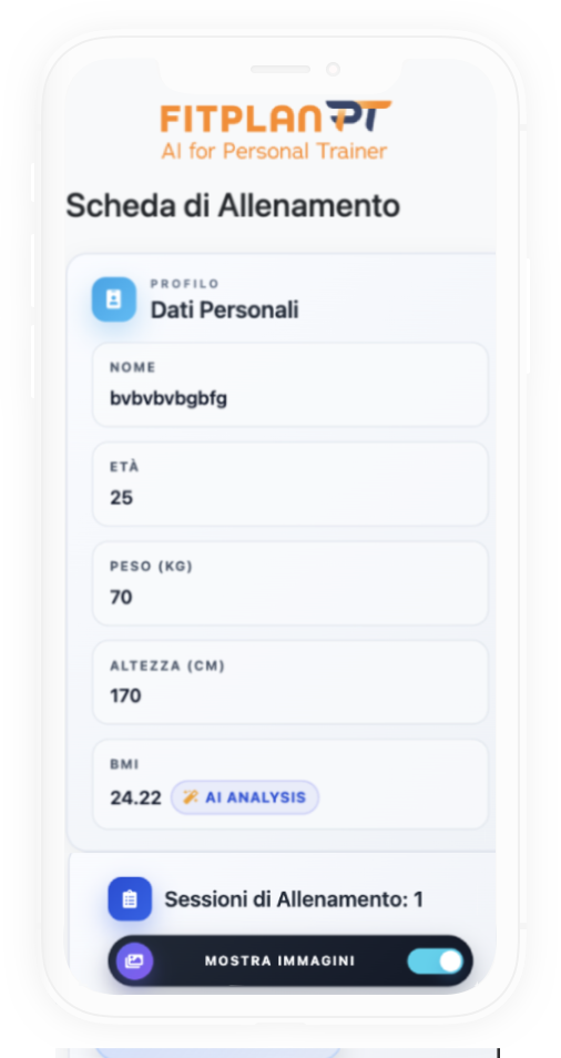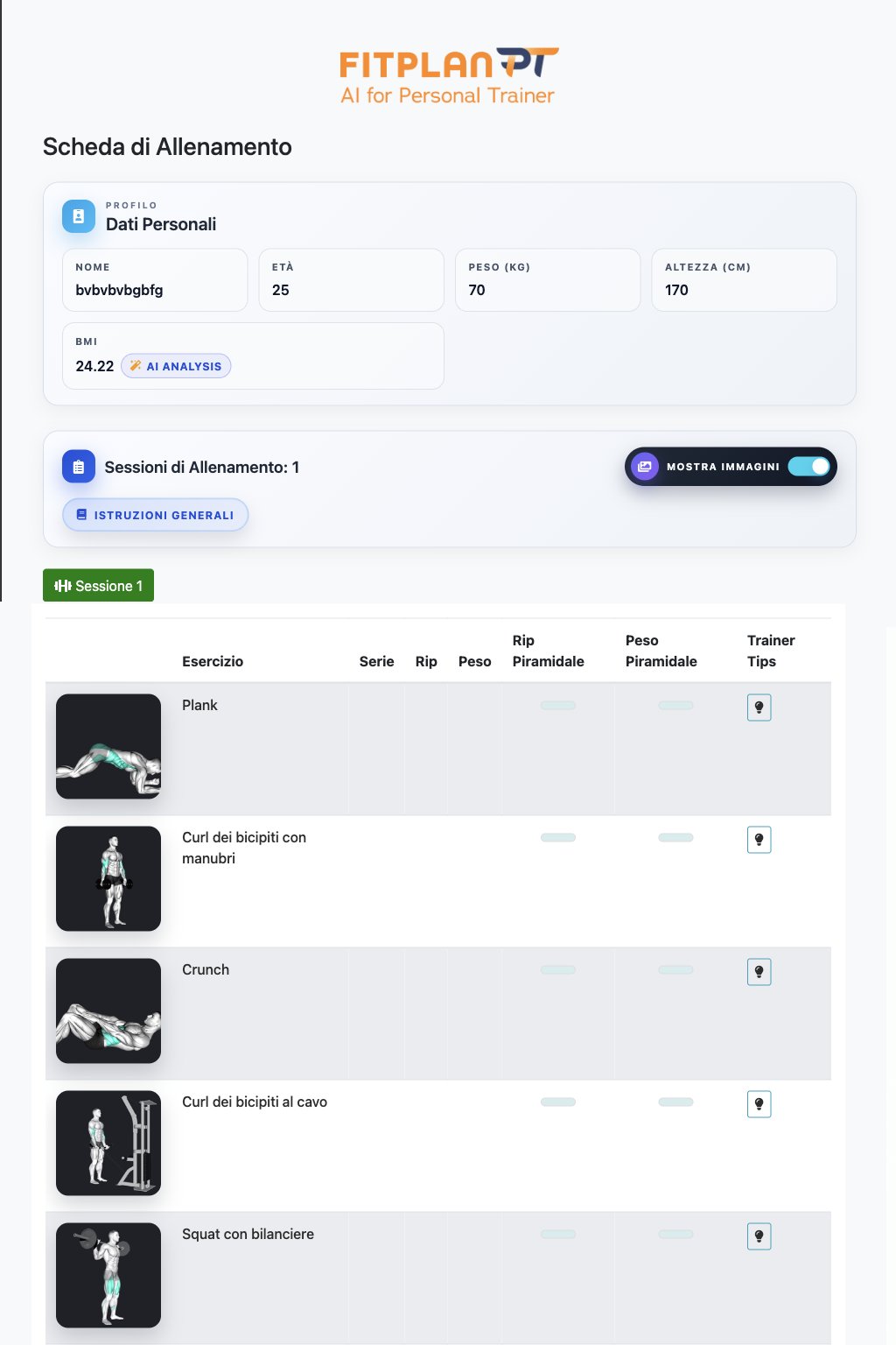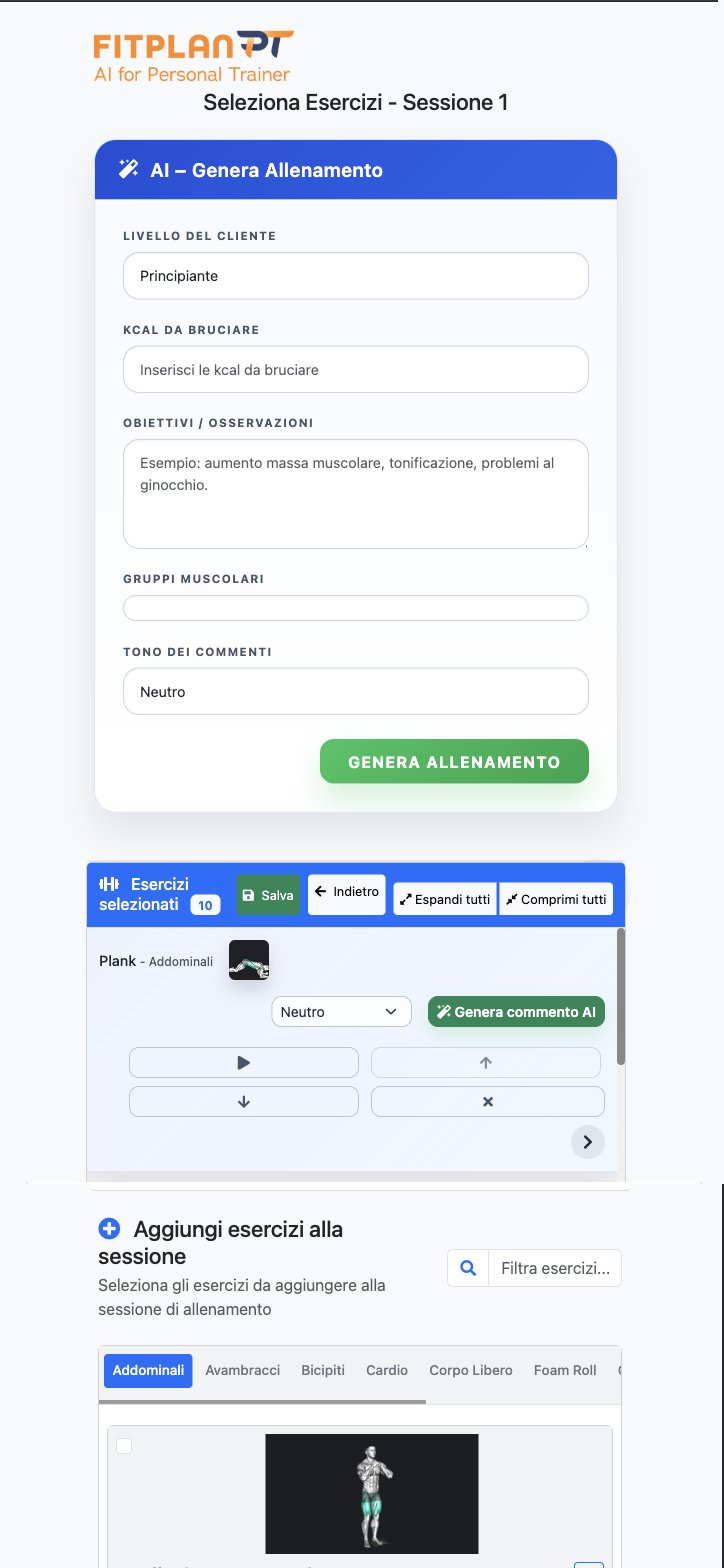 L'intelligenza artificiale di FitPlanPT semplifica la creazione di programmi di allenamento personalizzati. Inserisci il livello del cliente, le calorie da bruciare e i gruppi muscolari target, e l'AI genererà istantaneamente un piano di allenamento ottimizzato. Ogni programma è calibrato sulle specifiche esigenze del cliente, considerando obiettivi, livello di esperienza e preferenze di allenamento. Questo strumento innovativo permette ai Personal Trainer di risparmiare tempo prezioso nella pianificazione, mantenendo al contempo la massima qualità e personalizzazione degli allenamenti.